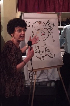(above) Giuseppina (Giusy) Romano-Clarke, MD, an attending physician at the MassGeneral Hospital for Children Newborn Services Department, uses clever drawings to explain her work in changing the way babies get evaluated and treated for possible infection